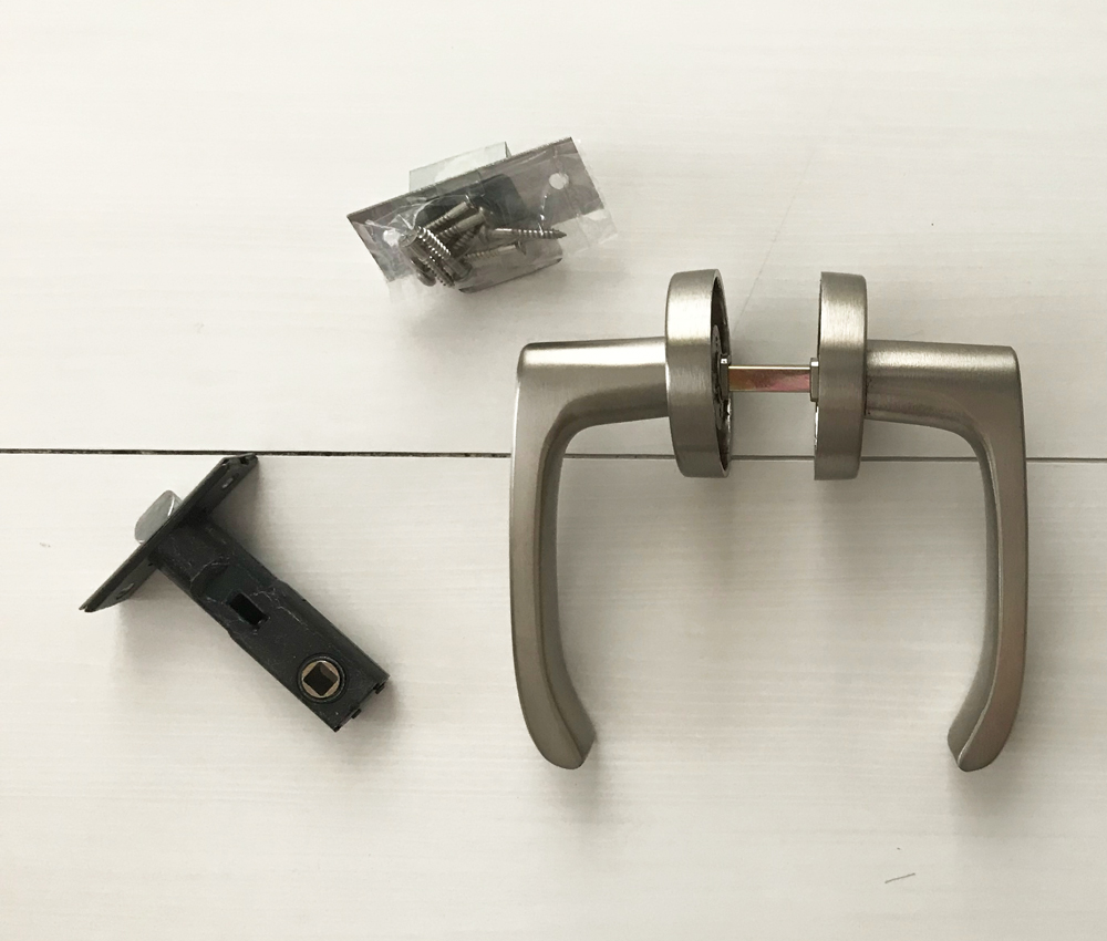 古いドアノブは外れたので、新しいレバーハンドルを取り付けます。